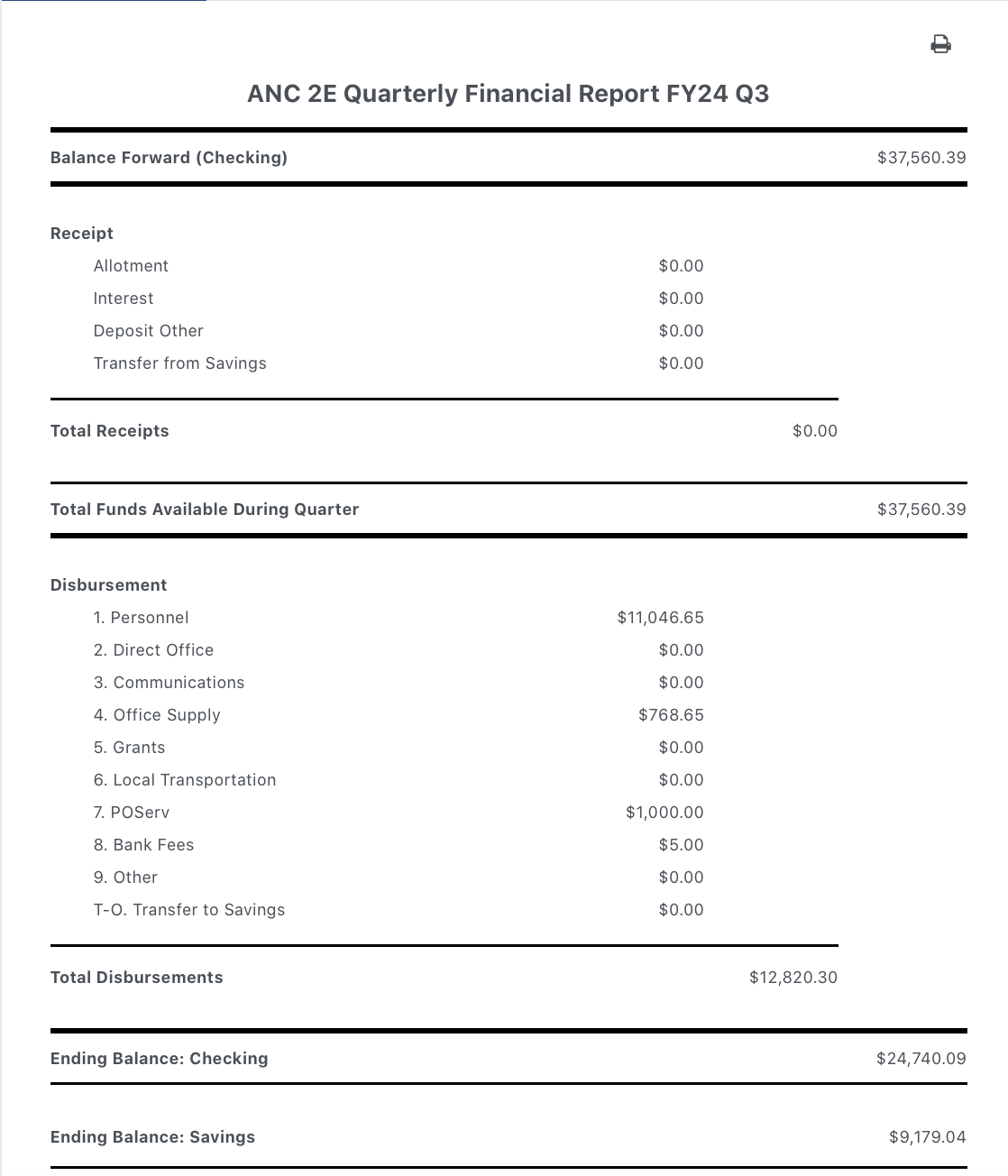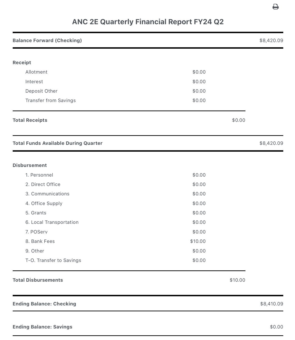 Please see up to date financial reports here: https://oanc.dc.gov/anc-profile-listing